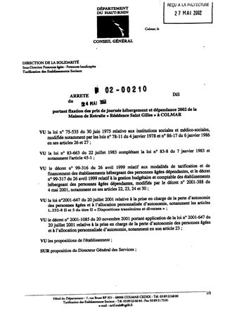 Portant fixation des prix de journée hébergement et dépendance 2002 de la Maison de Retraite Résidence Saint Gilles à COLMAR Resumé Pièces jointes ARRETE Assemblée : Non défini Date : 24/05/2002 Rapporteur : Non défini Collectivité : Conseil départemental du Haut-Rhin Direction : Non défini Service : Service de la Tarification des Etablissements Domaine : Prix de Journée Commission :
