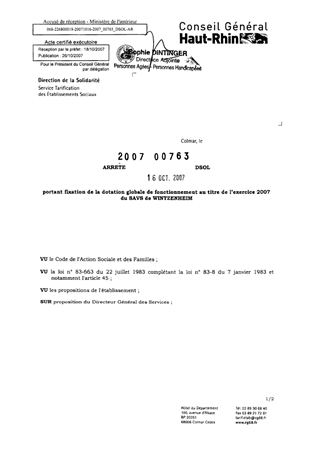 portant fixation de la dotation globale de fonctionnement au titre de l'exercice 2007 du SAVS de WINTZENHEIM. Resumé Pièces jointes ARRETE Assemblée : Non défini Date : 16/10/2007 Rapporteur : Non défini Collectivité : Conseil départemental du Haut-Rhin Direction : Non défini Service : Service de la Tarification des Etablissements Domaine : Dotations financières Commission :