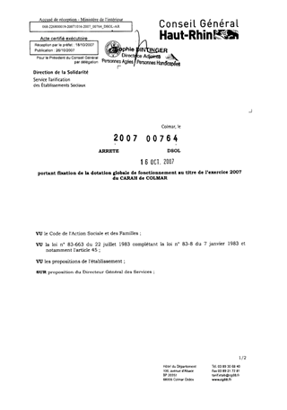 portant fixation de la dotation gloable de fonctionnement au titre de l'exercice 2007 du CARAH de COLMAR. Resumé Pièces jointes ARRETE Assemblée : Non défini Date : 16/10/2007 Rapporteur : Non défini Collectivité : Conseil départemental du Haut-Rhin Direction : Non défini Service : Service de la Tarification des Etablissements Domaine : Dotations financières Commission :