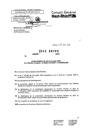 portant fixation du prix de journée 2007 de la maison d'enfants "Le Rayon de Soleil" à GUEBWILLER. Resumé Pièces jointes ARRETE Assemblée : Non défini Date : 17/10/2007 Rapporteur : Non défini Collectivité : Conseil départemental du Haut-Rhin Direction : Non défini Service : Service de la Tarification des Etablissements Domaine : Prix de Journée Commission :
