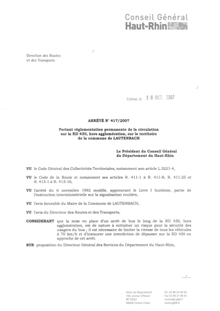 portant réglementation permanente de la circulation sur la RD 430, hors agglomération, sur le territoire de la commune de LAUTENBACH. Resumé Pièces jointes ARRETE Assemblée : Non défini Date : 18/10/2007 Rapporteur : Non défini Collectivité : Conseil départemental du Haut-Rhin Direction : Non défini Service : Direction des Routes Domaine : Circulation Commission :