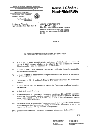 portant déclassement dans le domaine privé du Département d'une parcelle de terrain sur la commune de BERGHEIM - RD 42 Resumé Pièces jointes ARRETE Assemblée : Non défini Date : 18/10/2007 Rapporteur : Non défini Collectivité : Conseil départemental du Haut-Rhin Direction : Non défini Service : Service du Patrimoine et du droit des Sols Domaine : Déclassement de voirie Commission :