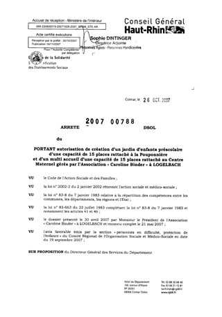 portant autorisation de création d'un jardin d'enfants préscolaire d'une capacité de 15 places rattaché à la pouponnière et d'un multi-accueil d'une capacité de 15 places rattaché au centre maternel gérés par l'association "Caroline Binder" à LOGELBACH.