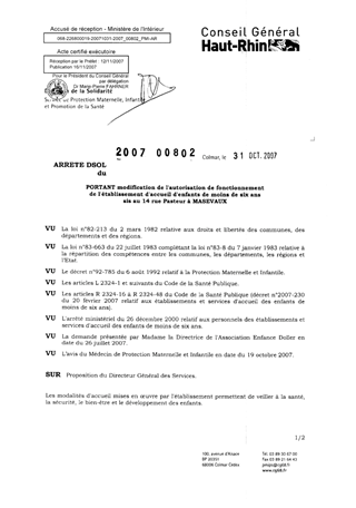portant modification de l'autorisation de fonctionnement de l'établissement d'accueil d'enfants de moins de six ans sis au 14 rue Pasteur à MASEVAUX. Resumé Pièces jointes ARRETE Assemblée : Non défini Date : 31/10/2007 Rapporteur : Non défini Collectivité : Conseil départemental du Haut-Rhin Direction : Non défini Service : Service de Protection Maternelle et Infantile Domaine : Accueil d'enfants Commission :