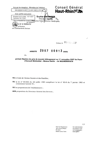portant fixation du prix de journée hébergement au 1er novembre 2007 du foyer d'accueil médicalisé "Maison Emilie" de MALMERSPACH. Resumé Pièces jointes ARRETE Assemblée : Non défini Date : 15/11/2007 Rapporteur : Non défini Collectivité : Conseil départemental du Haut-Rhin Direction : Non défini Service : Service de la Tarification des Etablissements Domaine : Prix de Journée Commission :
