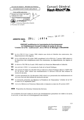portant modification de l'autorisation de fonctionnement de l'établissement d'accueil d'enfants de moins de six ans "L'Atelier de la Vie - multi accueil", sis au 30 f, rue de Hirsingue à MULHOUSE. Resumé Pièces jointes ARRETE Assemblée : Non défini Date : 16/11/2007 Rapporteur : Non défini Collectivité : Conseil départemental du Haut-Rhin Direction : Non défini Service : Service de Protection Maternelle et Infantile Domaine : Accueil d'enfants Commission :