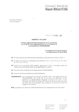 portant réglementation permanente de la circulation sur la RD 29, hors agglomération, sur le territoire de la commune de VOLGELSHEIM. Resumé Pièces jointes ARRETE Assemblée : Non défini Date : 28/11/2007 Rapporteur : Non défini Collectivité : Conseil départemental du Haut-Rhin Direction : Non défini Service : Direction des Routes Domaine : Circulation Commission :