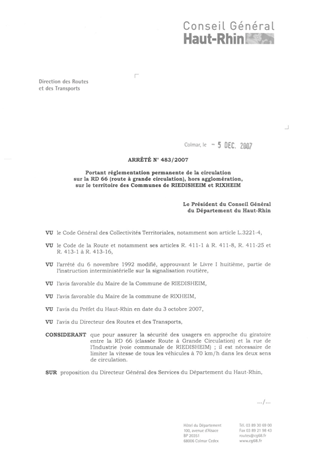 portant réglementation permanente de la circulation sur la RD 66 (route à grande circulation), hors agglomération, sur le territoire des communes de RIEDISHEIM et RIXHEIM. Resumé Pièces jointes ARRETE Assemblée : Non défini Date : 05/12/2007 Rapporteur : Non défini Collectivité : Conseil départemental du Haut-Rhin Direction : Non défini Service : Direction des Routes Domaine : Circulation Commission :