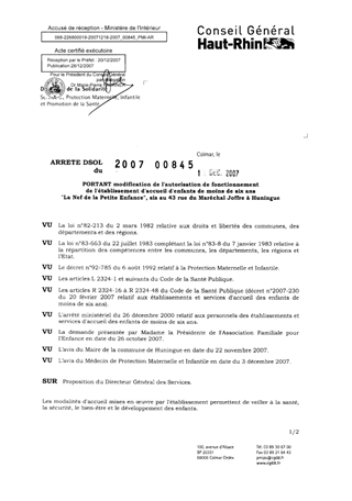 portant modification de l'autorisation de fonctionnement de l'établissement d'accueil d'enfants de moins de six ans "La Nef de la Petite Enfance", sis au 43 rue du Maréchal Joffre à HUNINGUE. Resumé Pièces jointes ARRETE Assemblée : Non défini Date : 18/12/2007 Rapporteur : Non défini Collectivité : Conseil départemental du Haut-Rhin Direction : Non défini Service : Service de Protection Maternelle et Infantile Domaine : Accueil d'enfants Commission :
