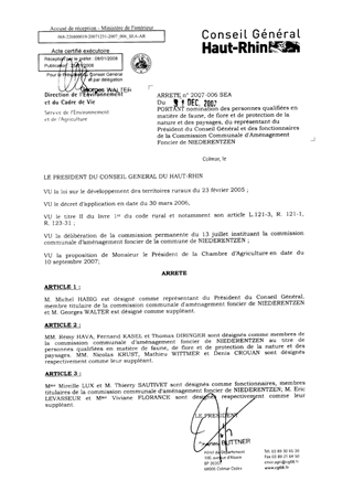 portant nomination des personnes qualifiées en matière de faune, de flore et de protection de la nature et des paysages, du représentant du Président du Conseil Général et des fonctionnaires de la Commission Com. d'Aménagement Foncier de NIEDERENTZEN.