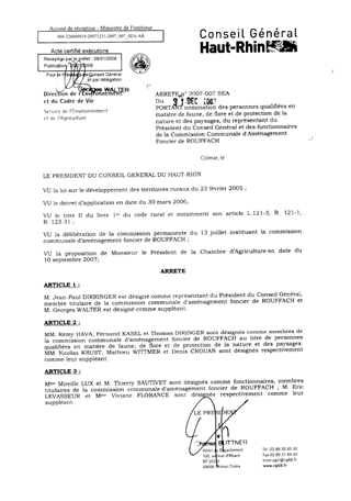 portant nomination des personnes qualifiées en matière de faune, de flore et de protection de la nature et des paysages, du représentant du Président du Conseil Général et des fonctionnaires de la Commission Communale d'Aménagement Foncier de ROUFFACH.