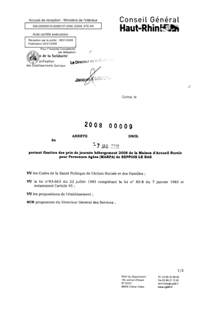 portant fixation des prix de journée hébergement 2008 de la maison d'accueil rurale pour personnes âgées (MARPA) de SEPPOIS LE BAS. Resumé Pièces jointes ARRETE Assemblée : Non défini Date : 07/01/2008 Rapporteur : Non défini Collectivité : Conseil départemental du Haut-Rhin Direction : Non défini Service : Service de la Tarification des Etablissements Domaine : Prix de Journée Commission :