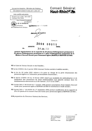 portant réglementation de la capacité de 24 places d'hébergement permanent à 23 places d'hébergement permanent et 1 place d'hébergement temporaire de la maison d'accueil rurale pour personnes âgées (MARPA) à SEPPOIS LE BAS. Resumé Pièces jointes ARRETE Assemblée : Non défini Date : 07/01/2008 Rapporteur : Non défini Collectivité : Conseil départemental du Haut-Rhin Direction : Non défini Service : Service de la Tarification des Etablissements Domaine : Autres (non classés) Commission :