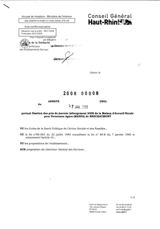 portant fixation des prix de journée hébergement 2008 de la Maison d'Accueil Rurale pour personnes âgées (MARPA) de BRECHAUMONT. Resumé Pièces jointes ARRETE Assemblée : Non défini Date : 07/01/2008 Rapporteur : Non défini Collectivité : Conseil départemental du Haut-Rhin Direction : Non défini Service : Service de la Tarification des Etablissements Domaine : Prix de Journée Commission :