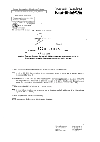 portant fixation des prix de journée hébergement et dépendance 2008 de la maison de retraite du centre hospitalier de PFASTATT. Resumé Pièces jointes ARRETE Assemblée : Non défini Date : 07/01/2008 Rapporteur : Non défini Collectivité : Conseil départemental du Haut-Rhin Direction : Non défini Service : Service de la Tarification des Etablissements Domaine : Prix de Journée Commission :