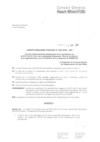 portant réglementation permanente de la circulation sur la RD 9 bis IV et la voie communale dénommée "Rue de la Lisière", hors agglomération, sur le territoire de la commune de RIESPACH. Resumé Pièces jointes ARRETE Assemblée : Non défini Date : 14/01/2008 Rapporteur : Non défini Collectivité : Conseil départemental du Haut-Rhin Direction : Non défini Service : Direction des Routes Domaine : Circulation Commission :