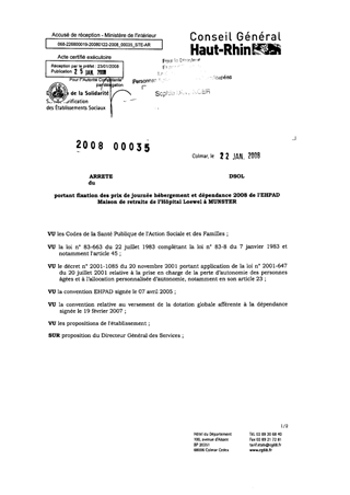 portant fixation des prix de journée hébergement et dépendance 2008 de l'EHPAD maison de retraite de l'hôpital Loewel à MUNSTER. Resumé Pièces jointes ARRETE Assemblée : Non défini Date : 22/01/2008 Rapporteur : Non défini Collectivité : Conseil départemental du Haut-Rhin Direction : Non défini Service : Service de la Tarification des Etablissements Domaine : Prix de Journée Commission :