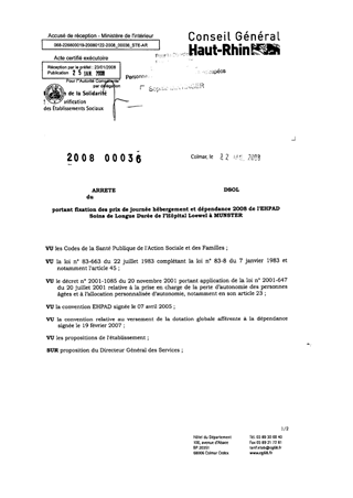portant fixation des prix de journée et dépendance 2008 de l'EHPAD soins de longue durée de l'hôpital Loewel à MUNSTER. Resumé Pièces jointes ARRETE Assemblée : Non défini Date : 22/01/2008 Rapporteur : Non défini Collectivité : Conseil départemental du Haut-Rhin Direction : Non défini Service : Service de la Tarification des Etablissements Domaine : Prix de Journée Commission :