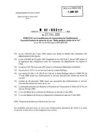 Portant sur la modification de l'autorisation de l'établissement d'accueil d'enfants de moins de six ans Halte garderie Atelier de la Vie Resumé Pièces jointes ARRETE Assemblée : Non défini Date : 27/05/2002 Rapporteur : Non défini Collectivité : Conseil départemental du Haut-Rhin Direction : Non défini Service : Service de Protection Maternelle et Infantile Domaine : Accueil d'enfants Commission :