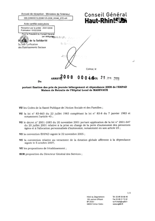 portant fixation des prix de journée hébergement et dépendance 2008 de l'EHPAD maison de retraite de l'hôpital local de MASEVAUX. Resumé Pièces jointes ARRETE Assemblée : Non défini Date : 25/01/2008 Rapporteur : Non défini Collectivité : Conseil départemental du Haut-Rhin Direction : Non défini Service : Service de la Tarification des Etablissements Domaine : Prix de Journée Commission :