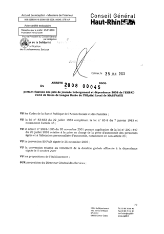portant fixation des prix de journée hébergement et dépendance 2008 de l'EHPAD unité de soins de longue durée de l'hôpital local de MASEVAUX. Resumé Pièces jointes ARRETE Assemblée : Non défini Date : 25/01/2008 Rapporteur : Non défini Collectivité : Conseil départemental du Haut-Rhin Direction : Non défini Service : Service de la Tarification des Etablissements Domaine : Prix de Journée Commission :
