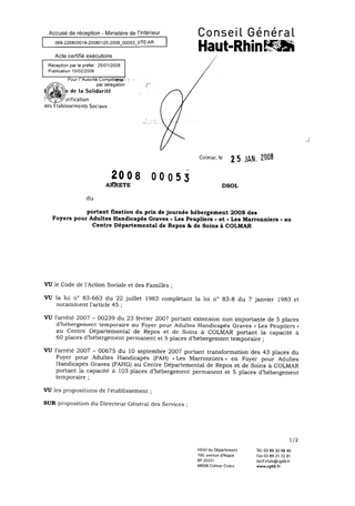 portant fixation du prix de journée hébergement 2008 des foyers pour adultes handicapés graves "Les Peupliers" et "Les Marronniers" au centre départemental de repos et de soins à COLMAR. Resumé Pièces jointes ARRETE Assemblée : Non défini Date : 25/01/2008 Rapporteur : Non défini Collectivité : Conseil départemental du Haut-Rhin Direction : Non défini Service : Service de la Tarification des Etablissements Domaine : Prix de Journée Commission :