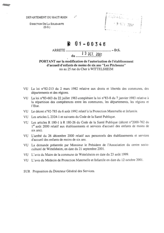 portant sur la modification de l'autorisation de l'établissement d'accueil d'enfants de moins de six ans "Les Pitchouns" sis au 25 rue du Cher à Wittelsheim Resumé Pièces jointes ARRETE Assemblée : Non défini Date : 19/10/2001 Rapporteur : Non défini Collectivité : Conseil départemental du Haut-Rhin Direction : Non défini Service : Direction de la Solidarité Domaine : Accueil d'enfants Commission :