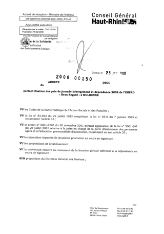 portant fixation des prix de journée hébergement et dépendance 2008 de l'EHPAD "Beau Regard" à MULHOUSE. Resumé Pièces jointes ARRETE Assemblée : Non défini Date : 25/01/2008 Rapporteur : Non défini Collectivité : Conseil départemental du Haut-Rhin Direction : Non défini Service : Service de la Tarification des Etablissements Domaine : Prix de Journée Commission :