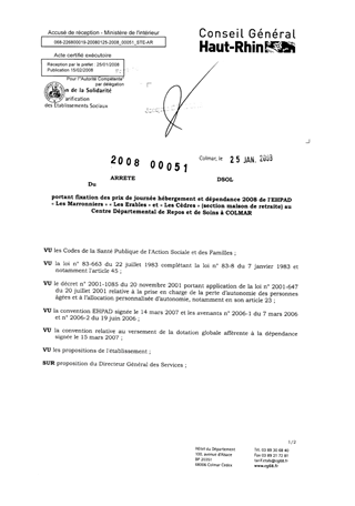 portant fixation des prix de journée hébergement et dépendance 2008 de l'EHPAD "Les Marronniers" "Les Erables" et "Les Cèdres" (section maison de retraite) au centre départemental de repos et de soins à COLMAR. Resumé Pièces jointes ARRETE Assemblée : Non défini Date : 25/01/2008 Rapporteur : Non défini Collectivité : Conseil départemental du Haut-Rhin Direction : Non défini Service : Service de la Tarification des Etablissements Domaine : Prix de Journée Commission :