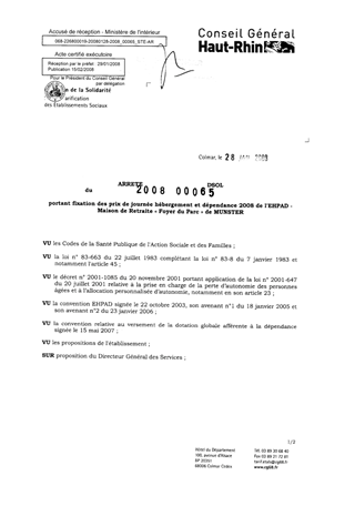 portant fixation des prix de journée hébergement et dépendance 2008 de l'EHPAD maison de retraite "foyer du Parc" de MUNSTER. Resumé Pièces jointes ARRETE Assemblée : Non défini Date : 28/01/2008 Rapporteur : Non défini Collectivité : Conseil départemental du Haut-Rhin Direction : Non défini Service : Service de la Tarification des Etablissements Domaine : Prix de Journée Commission :