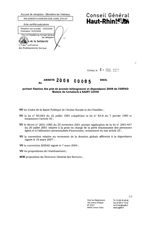 portant fixation des prix de journée hébergement et dépendance 2008 de l'EHPAD maison du Lertzbach à SAINT-LOUIS. Resumé Pièces jointes ARRETE Assemblée : Non défini Date : 06/02/2008 Rapporteur : Non défini Collectivité : Conseil départemental du Haut-Rhin Direction : Non défini Service : Service de la Tarification des Etablissements Domaine : Prix de Journée Commission :
