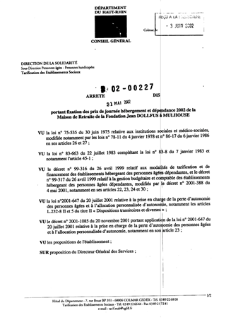 Portant fixation des prix de journée hébergement et dépendance 2002 de la Maison de Retraite de la Fondation Jean DOLLFUS à MULHOUSE Resumé Pièces jointes ARRETE Assemblée : Non défini Date : 31/05/2002 Rapporteur : Non défini Collectivité : Conseil départemental du Haut-Rhin Direction : Non défini Service : Service de la Tarification des Etablissements Domaine : Prix de Journée Commission :