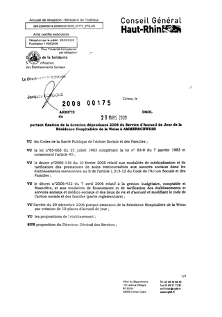 portant fixation de la dotation dépendance 2008 du Service d'Accueil de Jour de la résidence hospitalière de la Weiss à AMMERSCHWIHR. Resumé Pièces jointes ARRETE Assemblée : Non défini Date : 20/03/2008 Rapporteur : Non défini Collectivité : Conseil départemental du Haut-Rhin Direction : Non défini Service : Service de la Tarification des Etablissements Domaine : Dotations financières Commission :