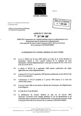 Portant organisation de l'enquête publique relative au déclassement et au reclassement dans le domaine privé départemental, d'une parcelle de terrain située le long de la RD 106 sur le territoire de la commune d'ILLHAEUSERN Resumé Pièces jointes ARRETE Assemblée : Non défini Date : 07/06/2002 Rapporteur : Non défini Collectivité : Conseil départemental du Haut-Rhin Direction : Non défini Service : Service du Patrimoine et du droit des Sols Domaine : Déclassement de voirie Commission :