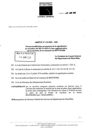 Portant modification permanente de la signalisation au carrefour des RD 4 et RD 4 I, hors agglomération, sur le territoire de la commune de BENNWIHR Resumé Pièces jointes ARRETE Assemblée : Non défini Date : 10/06/2002 Rapporteur : Non défini Collectivité : Conseil départemental du Haut-Rhin Direction : Non défini Service : Service Grands Projets Routiers Domaine : Circulation Commission :