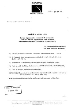 Portant réglementation permanente de la circulation sur la RD 103, hors agglomération, sur le territoire des communes de Gommersdorf et d'Hagenbach Resumé Pièces jointes ARRETE Assemblée : Non défini Date : 23/10/2001 Rapporteur : Non défini Collectivité : Conseil départemental du Haut-Rhin Direction : Non défini Service : Direction des Routes Domaine : Circulation Commission :