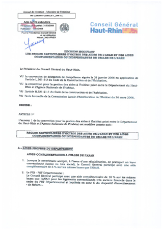 modifiant les règles particulières d'octroi des aides de l'ANAH et des aides complémentaires ou indépendantes de celles de l'ANAH. Resumé Pièces jointes ARRETE Assemblée : Non défini Date : 26/03/2008 Rapporteur : Non défini Collectivité : Conseil départemental du Haut-Rhin Direction : Non défini Service : Service Habitat et Solidarités Territoriales Domaine : Autres (non classés) Commission :