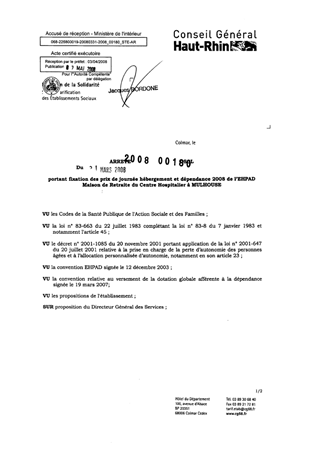 portant fixation des prix de journée hébergement et dépendance 2008 de l'EHPAD - Maison de retraite du centre hospitalier à MULHOUSE. Resumé Pièces jointes ARRETE Assemblée : Non défini Date : 31/03/2008 Rapporteur : Non défini Collectivité : Conseil départemental du Haut-Rhin Direction : Non défini Service : Service de la Tarification des Etablissements Domaine : Prix de Journée Commission :