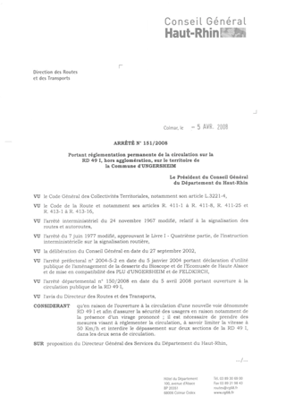 portant réglementation permanente de la circulation sur la RD 49 I, hors agglomération, sur le territoire de la commune d'UNGERSHEIM. Resumé Pièces jointes ARRETE Assemblée : Non défini Date : 05/04/2008 Rapporteur : Non défini Collectivité : Conseil départemental du Haut-Rhin Direction : Non défini Service : Direction des Routes Domaine : Circulation Commission :