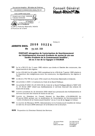 portant abrogation de l'autorisation de fonctionnement de l'établissement d'accueil d'enfants de moins de six ans "Jardin d'enfants de la communauté israélite", sis au 3 rue de la Cigogne à COLMAR. Resumé Pièces jointes ARRETE Assemblée : Non défini Date : 28/04/2008 Rapporteur : Non défini Collectivité : Conseil départemental du Haut-Rhin Direction : Non défini Service : Service de Protection Maternelle et Infantile Domaine : Accueil d'enfants Commission :
