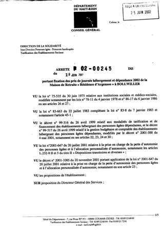 Portant fixation des prix de journée hébergement et dépendance 2002 de la Maison de Retraite Résidence d'Argenson à BOLLWILLER Resumé Pièces jointes ARRETE Assemblée : Non défini Date : 18/06/2002 Rapporteur : Non défini Collectivité : Conseil départemental du Haut-Rhin Direction : Non défini Service : Service de la Tarification des Etablissements Domaine : Prix de Journée Commission :