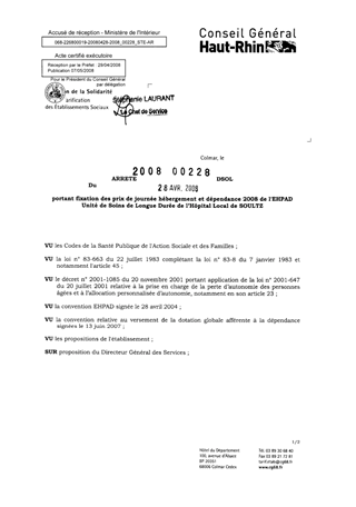 portant fixation des prix de journée hébergement et dépendance 2008 de l'EHPAD - Unité de soins de longue durée de l'hôpital local de SOULTZ. Resumé Pièces jointes ARRETE Assemblée : Non défini Date : 28/04/2008 Rapporteur : Non défini Collectivité : Conseil départemental du Haut-Rhin Direction : Non défini Service : Service de la Tarification des Etablissements Domaine : Prix de Journée Commission :