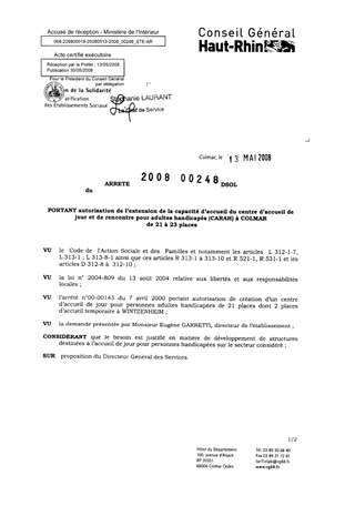 portant autorisation de l'extension de la capacité d'accueil du centre d'accueil de jour et de rencontre pour adultes handicapés (CARAH) à COLMAR de 21 à 23 places. Resumé Pièces jointes ARRETE Assemblée : Non défini Date : 13/05/2008 Rapporteur : Non défini Collectivité : Conseil départemental du Haut-Rhin Direction : Non défini Service : Service de la Tarification des Etablissements Domaine : Autres (non classés) Commission :