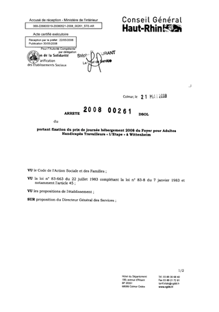 portant fixation du prix de journée hébergement 2008 du foyer pour adultes handicapés travailleurs "L'étape" à WITTENHEIM. Resumé Pièces jointes ARRETE Assemblée : Non défini Date : 21/05/2008 Rapporteur : Non défini Collectivité : Conseil départemental du Haut-Rhin Direction : Non défini Service : Service de la Tarification des Etablissements Domaine : Prix de Journée Commission :
