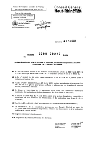 portant fixation du prix de journée et du forfait journalier complémentaire 2008 du lieu de vie "Cristo" à BIESHEIM. Resumé Pièces jointes ARRETE Assemblée : Non défini Date : 21/05/2008 Rapporteur : Non défini Collectivité : Conseil départemental du Haut-Rhin Direction : Non défini Service : Service de la Tarification des Etablissements Domaine : Prix de Journée Commission :