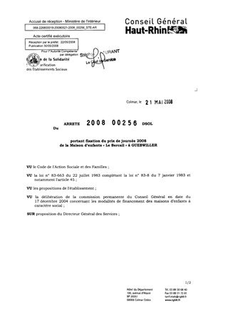 portant fixation du prix de journée 2008 de la maison d'enfants "Le Bercail" à GUEBWILLER. Resumé Pièces jointes ARRETE Assemblée : Non défini Date : 21/05/2008 Rapporteur : Non défini Collectivité : Conseil départemental du Haut-Rhin Direction : Non défini Service : Service de la Tarification des Etablissements Domaine : Prix de Journée Commission :