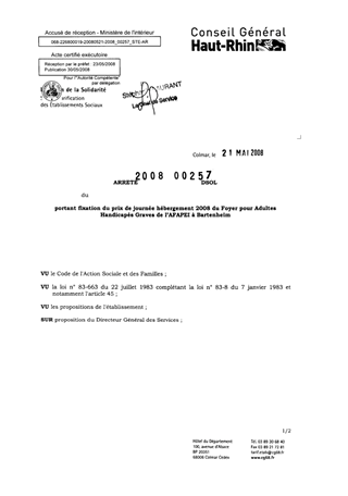 portant fixation du prix de journée hébergement 2008 du foyer pour adultes handicapés graves de l'AFAPEI à BARTENHEIM. Resumé Pièces jointes ARRETE Assemblée : Non défini Date : 21/05/2008 Rapporteur : Non défini Collectivité : Conseil départemental du Haut-Rhin Direction : Non défini Service : Service de la Tarification des Etablissements Domaine : Prix de Journée Commission :