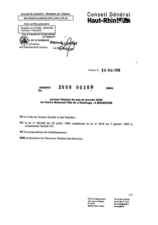 portant fixation du prix de journée 2008 du Centre Maternel Ville de "L'Ermitage" à MULHOUSE. Resumé Pièces jointes ARRETE Assemblée : Non défini Date : 26/05/2008 Rapporteur : Non défini Collectivité : Conseil départemental du Haut-Rhin Direction : Non défini Service : Service de la Tarification des Etablissements Domaine : Prix de Journée Commission :