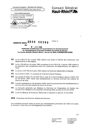 portant modification de l'autorisation de fonctionnement de l'établissement d'accueil d'enfants de moins de six ans "La Courte Echelle Planète Récré", sis rue du Rhin à HORBOURG-WIHR. Resumé Pièces jointes ARRETE Assemblée : Non défini Date : 02/06/2008 Rapporteur : Non défini Collectivité : Conseil départemental du Haut-Rhin Direction : Non défini Service : Service de Protection Maternelle et Infantile Domaine : Accueil d'enfants Commission :