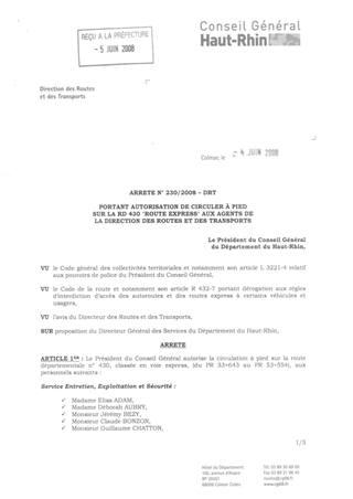 portant autorisation de circuler à pied sur la RD 430 "route express" aux agents de la direction des routes et des transports. Resumé Pièces jointes ARRETE Assemblée : Non défini Date : 04/06/2008 Rapporteur : Non défini Collectivité : Conseil départemental du Haut-Rhin Direction : Non défini Service : Direction des Routes Domaine : Circulation Commission :